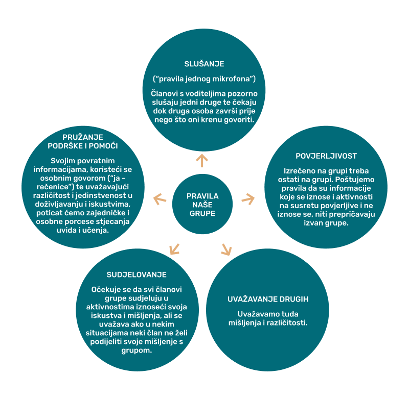 Riječ je o neformalnoj grupi u kojoj članovi razgovaraju o najrazličitijim životnim temama. Nerijetko se organiziraju stručna predavanja ili radionice o temama vezanim za mentalno zdravlje, zaštitu prava osoba s teškoćama mentalnog zdravlja za koje članovi iskažu interes. Rad se provodi u formi takozvane vršnjačke pomoći (“peer support“). Moderiraju ga stručnjaci – u pravilu psiholozi, ali po potrebi i ovisno o temi i profesionalci iz drugih pomagačkih struka.